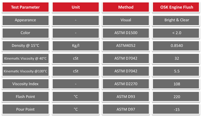 OSK LUBRICANTS ENGINE FLUSH is specially formulated for action to clean and remove sticky of rings, valves and hydraulic devices. This product is designed to meet and exceed your engine cleanliness requirements.